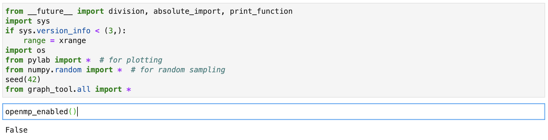 Hi, I use graph-tool on MacBookPro 13-inch, 2018(intel). I installed graph-tool by running `brew install graph-tool` I expected using openMP, but it seems disable. [image: スクリーンショット 2022-05-14 14.02.25.png] To use openMP on MacOS, should I do something? I already installed gcc and libomp. The following is my environment: - MacBookPro 13-inch, 2018 - 2.7 GHz quad core Intel Core i7 - MacOS Monterey (12.3.1) - Libraries - jypyterlab: 2.1.0 - python: 3.9.12 - graph-tool: 2.44
