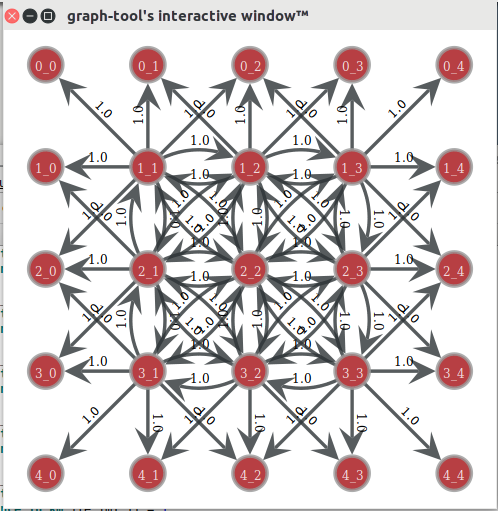 The following code creates a 5x5 graph where each edge that does not lie to the periphery of the square is connected to all neighboring edges with a weight of 1. The best path from vertex "3_1" to "1_2" is obvious the diagonal path which has a weight of 2. I was expecting that by setting epsilon=5, other paths would also be returned, for example (3_1, 3_2, 2_2, 1_2) that has weight of 4. Instead, the function crashes and returns the following error: Traceback (most recent call last): File "<input>", line 3, in <module> File "/home/labuser/anaconda3/envs/py35/lib/python3.5/site-packages/graph_tool/topology/__init__.py", line 1978, in all_shortest_paths _prop("v", g, all_preds_map)) MemoryError