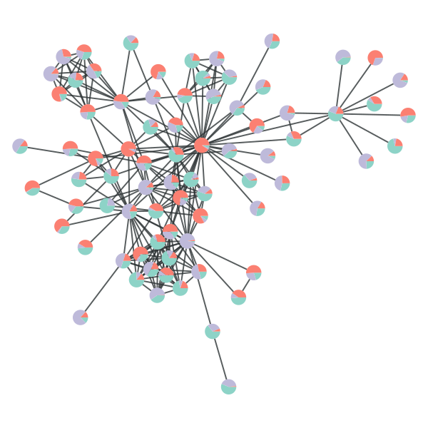You have to use a property map. For example: g = collection.data["lesmis"] pie_fracs = g.new_vertex_property("vector<double>") for v in g.vertices(): pie_fracs[v] = numpy.random.dirichlet([1, 1, 1]) graph_draw(g, pos=g.vp["pos"], vertex_shape="pie", vertex_pie_fractions=pie_fracs, output="pie.png") You can see the result attached. Best, Tiago -- Tiago de Paula Peixoto <tiago@skewed.de>
